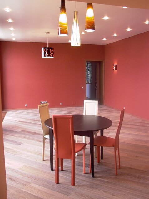 Мандариновые, коричные оттенки и вкрапление китайского красного придают кухне-гостиной апартаментов особенный восточный шарм. Природные фактуры, материалы и разноуровневое освещение наполняют приватное пространство светом, делают его гармоничнее.